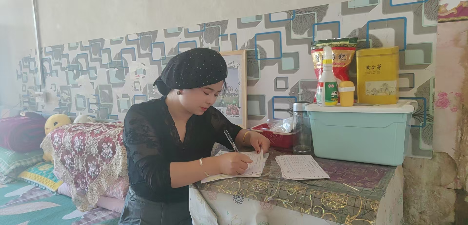 图为:宁夏东方惠民海源分公司协调员马小莲下乡入户工作照