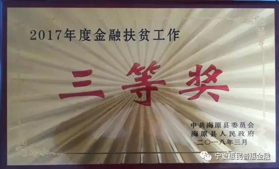3月2日,海原县2018精准扶贫大会县委、政府为宁夏东方惠民小额贷款股份有限公司海原分公司颁发了金融扶贫三等奖,以表示鼓励。