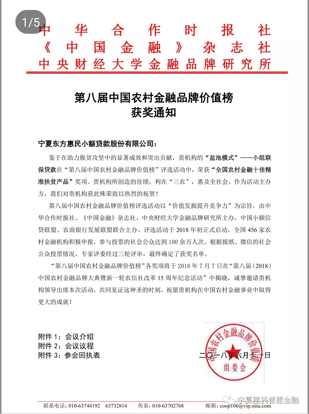6月26日,从“中国农村金融品牌价值榜”组委会传来喜讯,宁夏东方惠民小额贷款股份有限公司“盐池模式——小组联保贷款”在“第八届中国农村金融品牌价值榜”评选活动中,荣获“全国农村金融十佳精准扶贫产品”奖项。