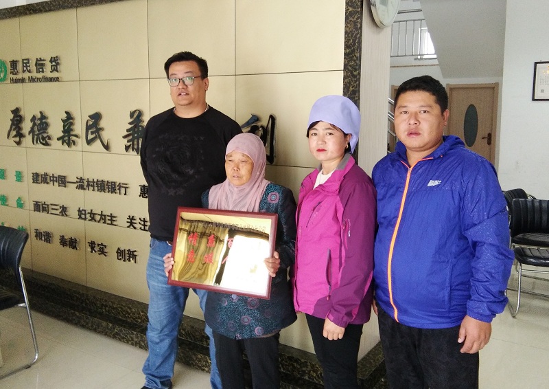 9月17日,今年60岁的同心县王团镇联合八村村民余秀英,将写有“情系百姓、意暖人间”的感谢牌匾送往宁夏东方惠民小额贷款股份有限公司同心分公司主任吕海涛手中,对惠民信贷表示感谢。