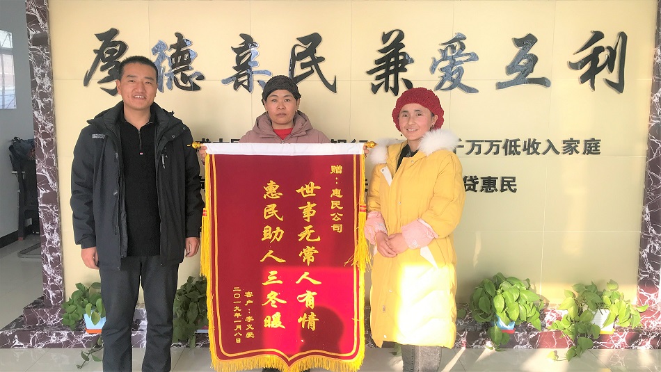 1月8日,海原县史店乡沙河村李义爱将写有“世事无常人有情、惠民助人三冬暖”字样的锦旗,送至宁夏东方惠民小额贷款股份有限公司海原分公司,对惠民公司表示感谢。