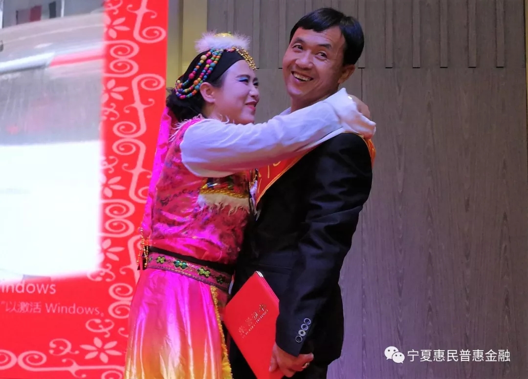 1月16日,在宁夏东方惠民小额贷款股份有限公司举办的“砥砺奋进、不忘初心”文艺晚会上,隆重表彰了支持惠民公司员工的10位家属,当晚会主持人提议获奖的夫妻相互拥抱时,红寺堡分公司推广员李芬芳转身送给丈夫马汉宝一个深深的拥抱,腼腆的马汉宝脸上堆满了羞涩的笑容。